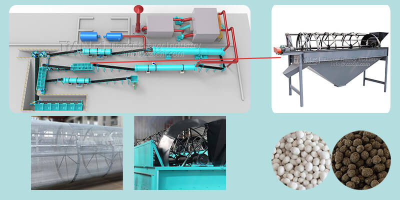 Particle screening machine is a screening equipment for classifying the size of materials, which is widely used in the fine and coarse screening operations of powder or particle materials such as fertilizer plants, granaries, coal yards, stone factories, wood processing plants, etc. Our screening machine adopts special screen, which has high screening efficiency and long service life; it has small installation inclination angle, and the screen hole is not easy to block; it has simple structure and convenient maintenance; it operates stably with low noise; it occupies small space and is convenient for process layout. The granules made by the disc granulator machine can be directly sieved to obtain fertilizer products of qualified size.